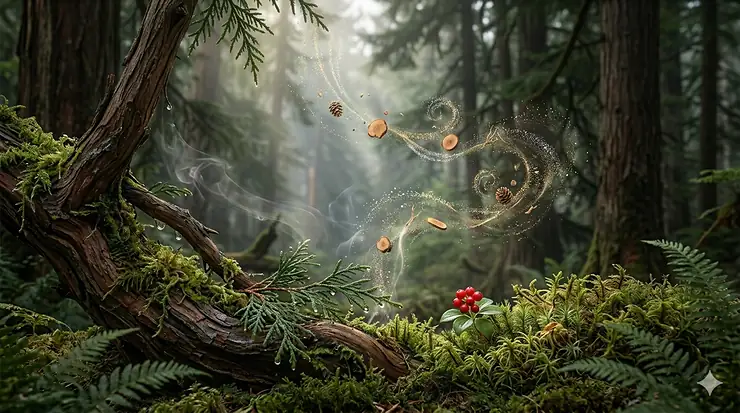 High-detail breakdown of woody cologne ingredients including Canadian red cedar, sandalwood, and earthy vetiver root.